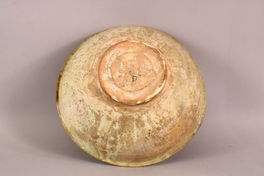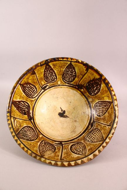 A NISHAPUR YELLOW GLAZED POTTERY BOWL, the centre with a stylised bird, 30cm diameter.