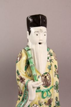 A PAIR OF CHINESE FAMILLE VERTE PORCELAIN IMMORTAL FIGURES, each figure holding a staff or stick, 32cm high.