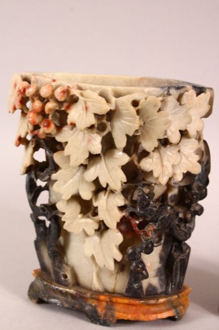 A PAIR OF CHINESE CARVED SOAPSTONE VASES - each carved in relief depicting flora -- each mounted to a base - 12cm