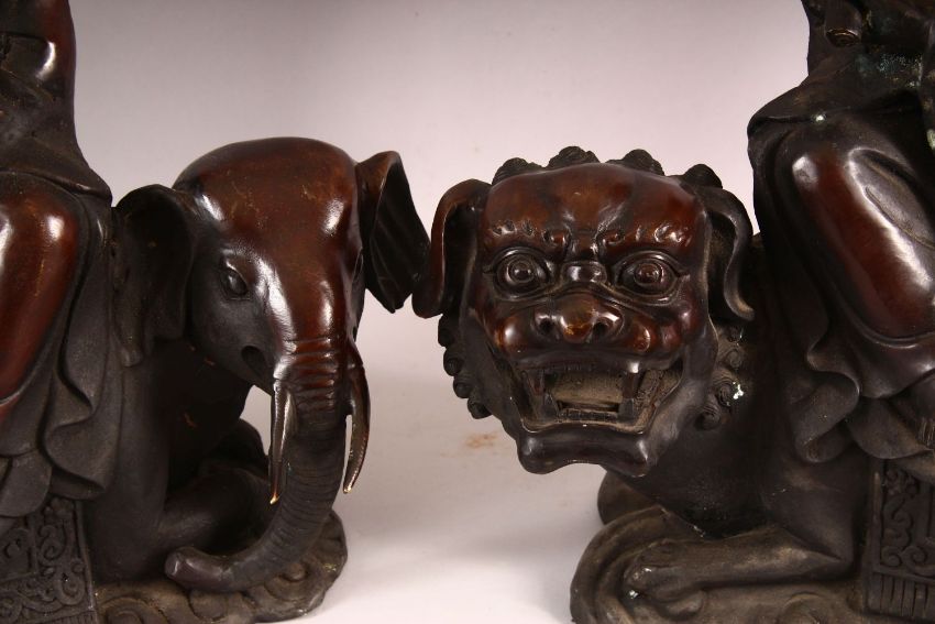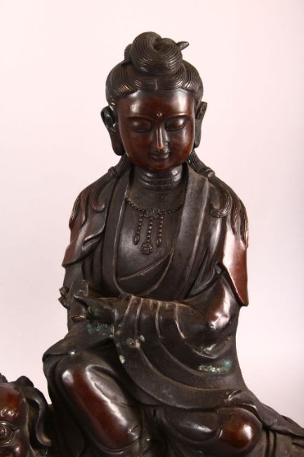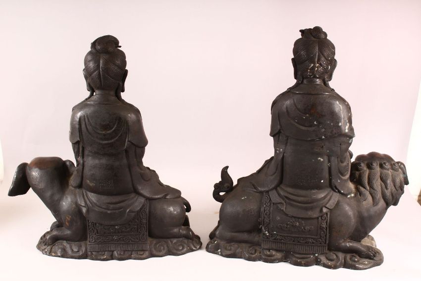 A PAIR OF CHINESE CAST BRONZE FIGURES OF GUANYIN SEATED UPON LION DOGS, Each impressed to the verso with a six character mark, 52cm wide x 60cm high.