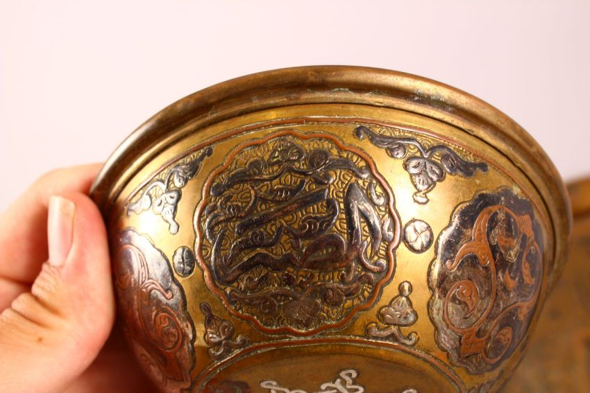 AN ISLAMIC CAIRO WARE SILVER AND COPPER INLAID BRASS TRAY, 34cm diameter, together with a small silver inlaid and coppered bowl, 19cm diameter, and a small silver and copper inlaid bowl, 12.5cm diameter.