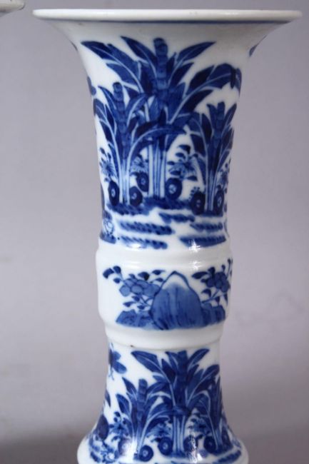 A PAIR OF 19TH CENTURY OR LATER CHINESE BLUE & WHITE PORCELAIN GU VASES, The body of the vases decorated with native landscape views, one AF, 15cm high .