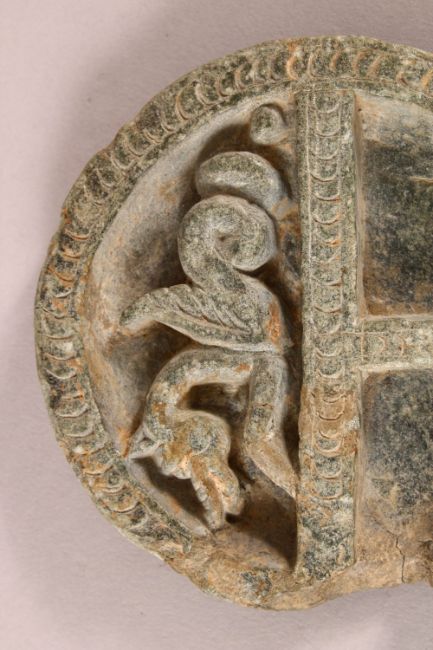 A GANDHARA ENGRAVED STONE SECTIONAL DISH, one section carved as a dragon, 11.5cm diameter.