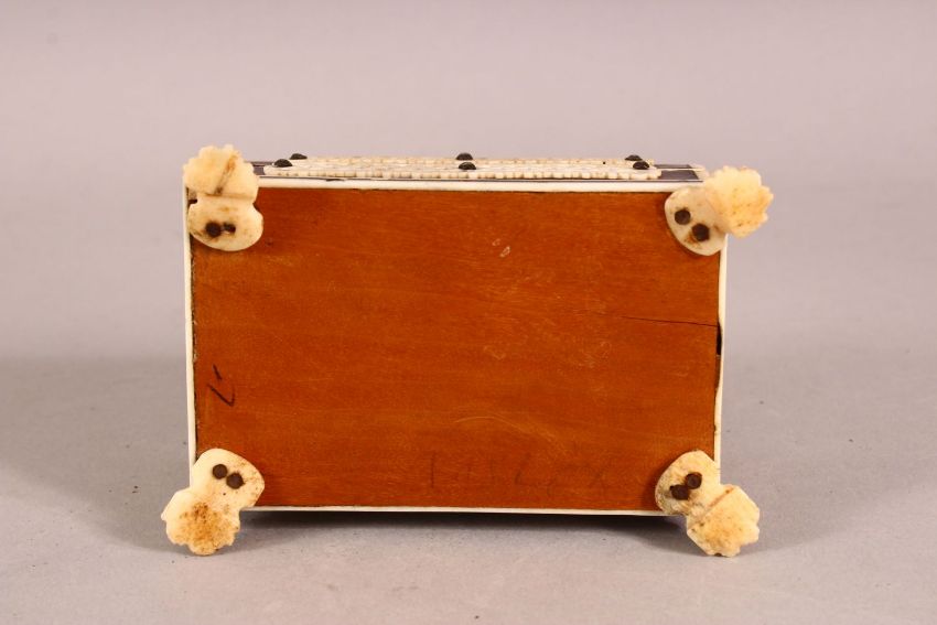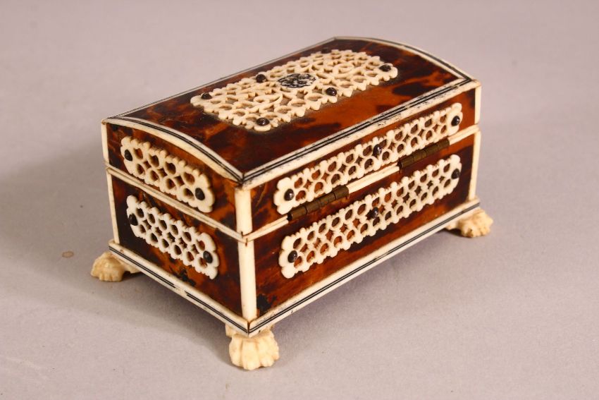 A SMALL INDIAN SHELL & IVORY BOX - the body with tortoiseshell veneer with overlaid carved ivory openwork, with claw feet, 9cm x 6cm