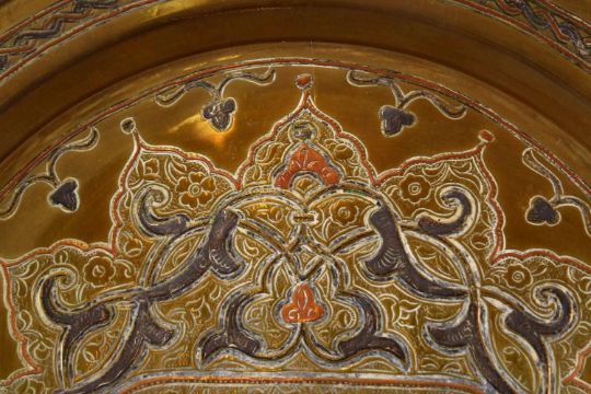A DAMASCUS SILVER INLAID BRASS CIRCULAR DISH, 31cm diameter.
