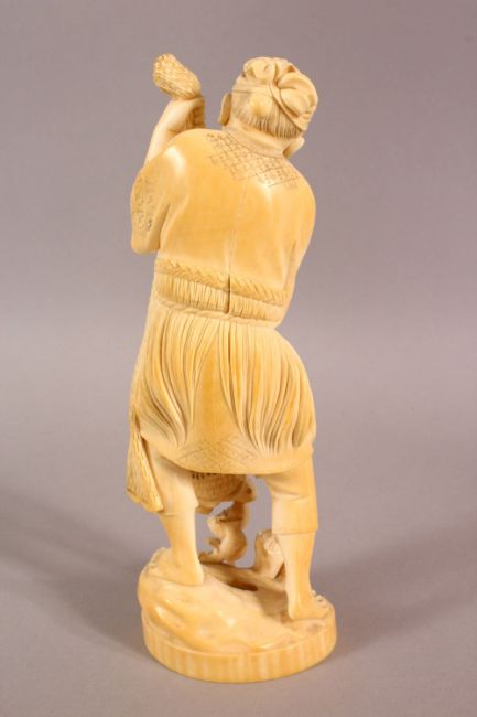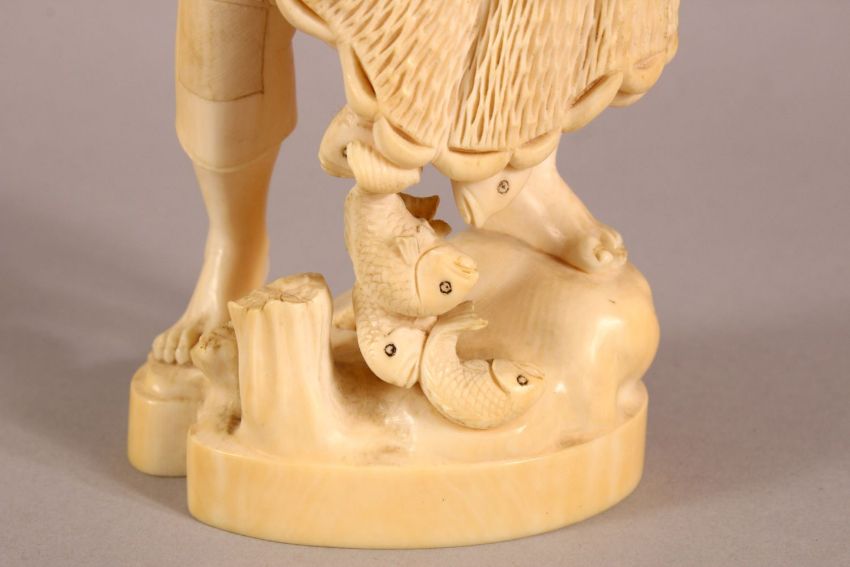 A FINE QUALITY JAPANESE MEIJI PERIOD CARVED IVORY OKIMONO OF A FISHERMAN, one-piece carving, the base with seal mark, 20cm high.