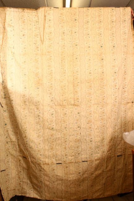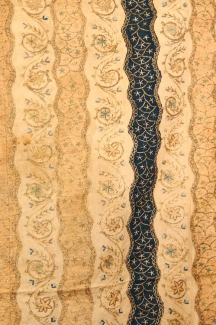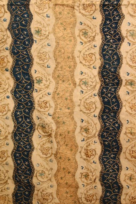 A LARGE INDIAN EMBROIDERED SILK TEXTILE HANGING - finely embroidered with scrolling floral motif decoration.