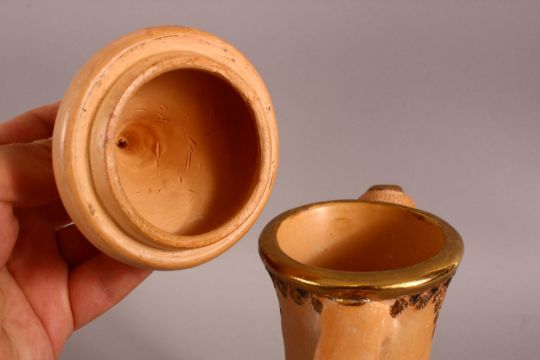 A TURKISH TOPHANE POTTERY COFFEE POT - with carved motif decoration highlighted in gilt - 30cm high