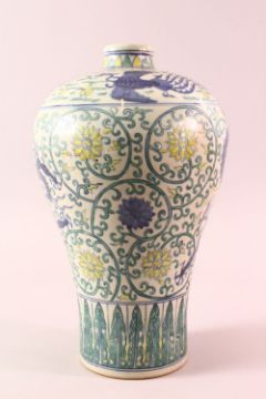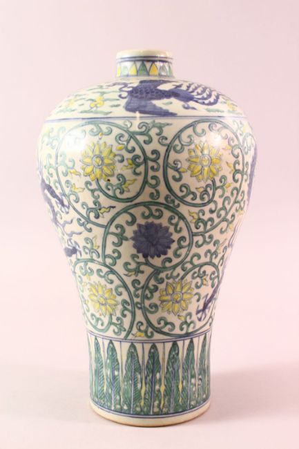 A CHINESE MING STYLE SANCAI DECORATED PORCELAIN MEIPING VASE, decorated with dragons amongst lotus, neck with a six character mark 34cm