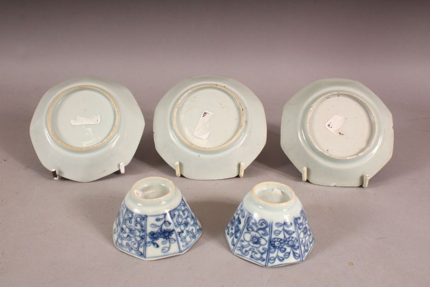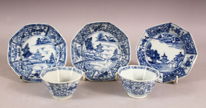 A TWO CHINESE BLUE & WHITE PORCELAIN TEA BOWLS & THREE SAUCERS - Each with similar landscape decoration - cup: 6.5cm saucers: 10cm (6)