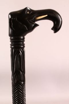 A GOOD CEYLONESE CARVED EBONY ELEPHANT HANDLE WALKING STICK - carved handle in the form of an elephant, with a carved body, with carved ivory tusks, 93cm