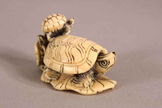 A JAPANESE MEIJI PERIOD CARVED IVORY NETSUKE in the form of a turtle upon a lily pad with two hatchlings at the rear, the underside with mark, 5cm long x 3cm high.