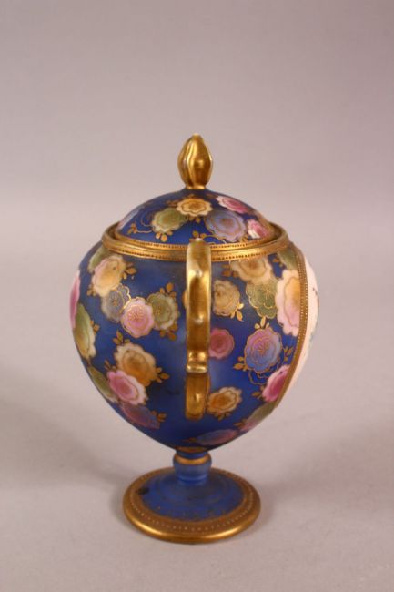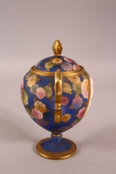 A SMALL JAPANESE NORITAKE TWIN HANDLE LIDDED PORCELAIN VASE - with a light blue ground with floral decoration - the base marked for Noritake Japan - 14cm