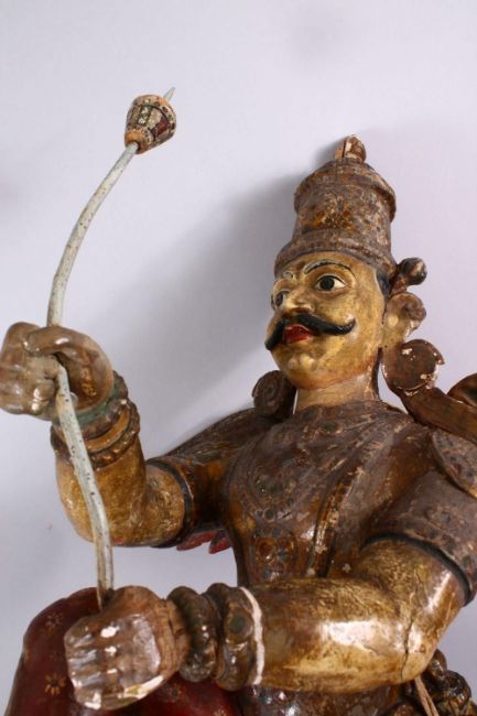 A 19TH CENTURY INDIAN / BURMESE CARVED WOOD FIGURE OF A WINGED GOD, stood holding an implement, with wings, with painted decoration, 96cm high x 62cm wide.