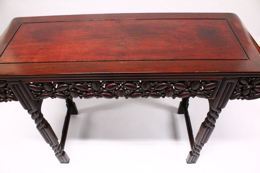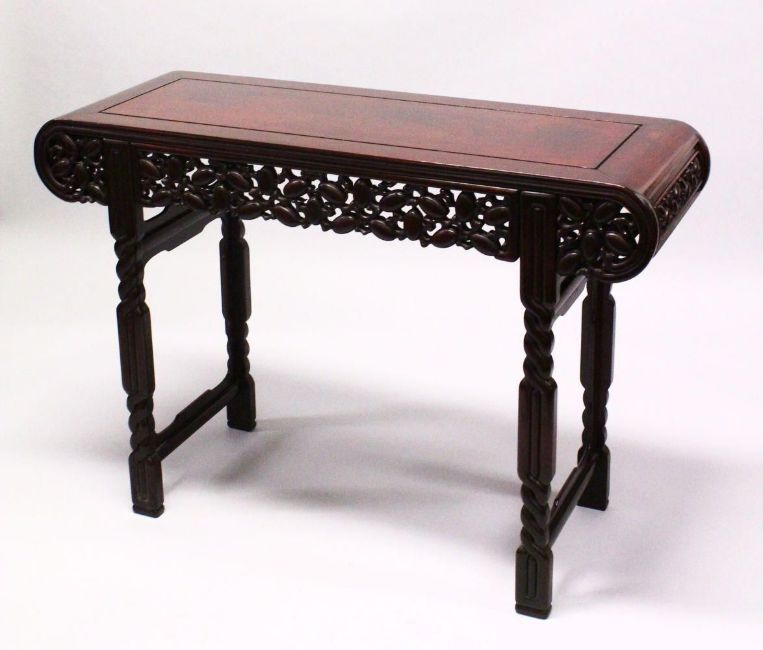 A GOOD 20TH CENTURY CHINESE ROSEWOOD ALTER TABLE, with scroll ends, pierced and carved frieze and simulated rope twist legs, 122cm long, 43cm deep, 84cm high.