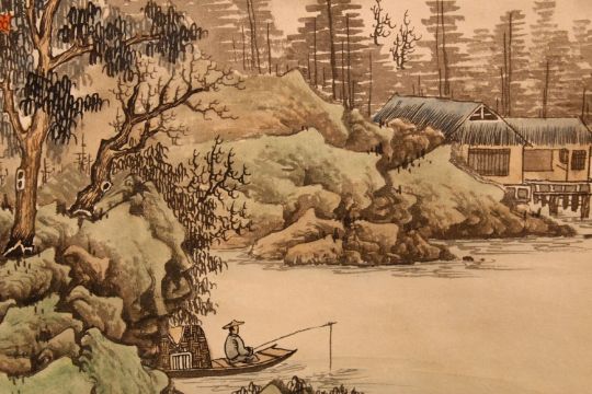 A CHINESE PAINTED HANGING SCROLL - LANDSCAPE - the painting depicting a native landscape scene with calligraphy and seal to the upper right.