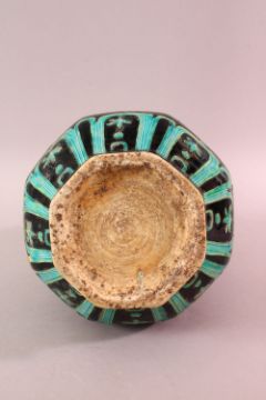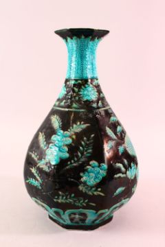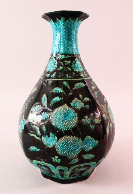 A MING STYLE TURQUOISE DECORATED FAHUA YUCHUNPIN PORCELAIN VASE - decorated upon a blackk ground with turquoise flora and fruit -- 31cm