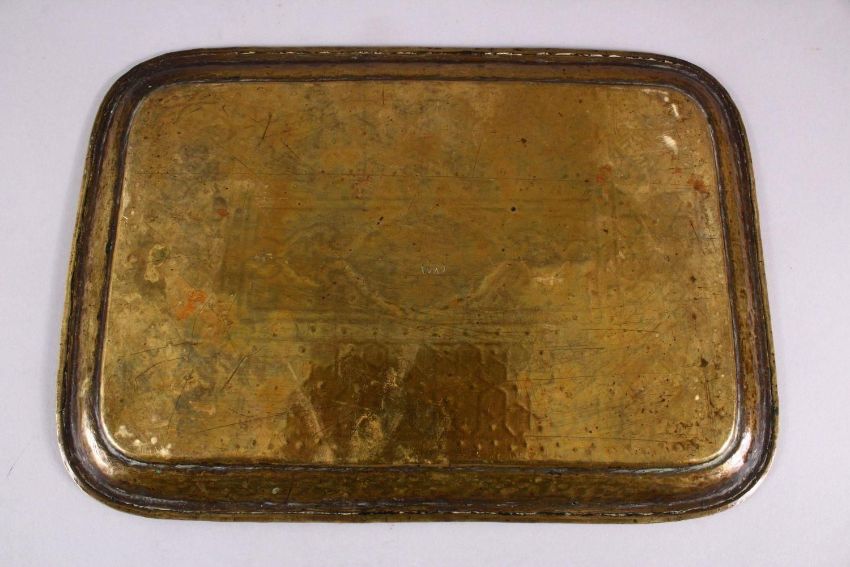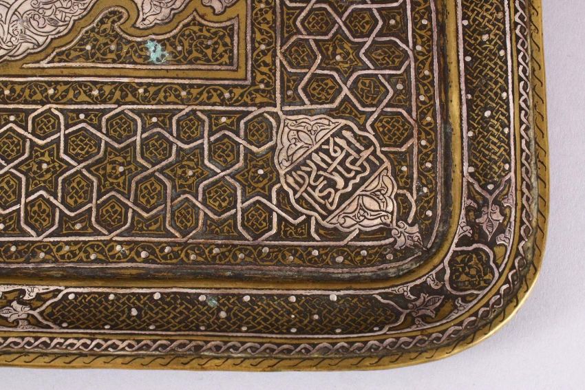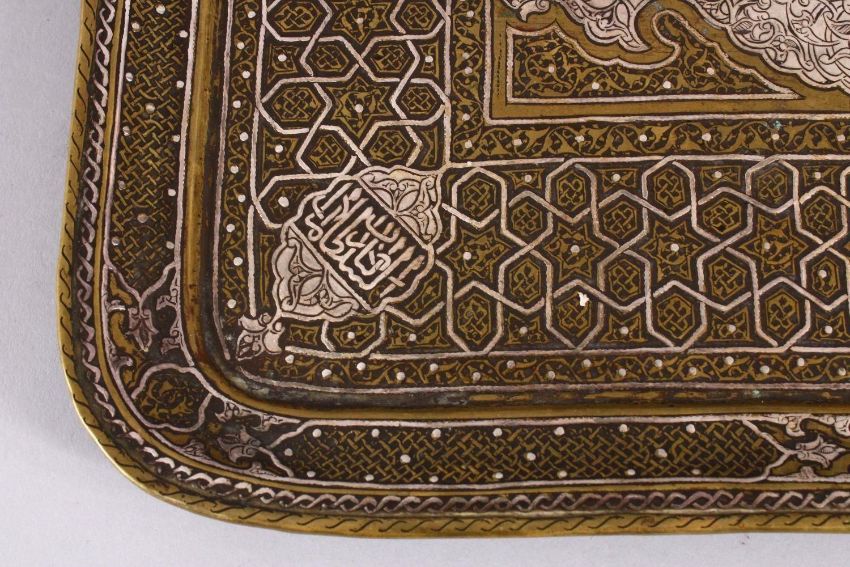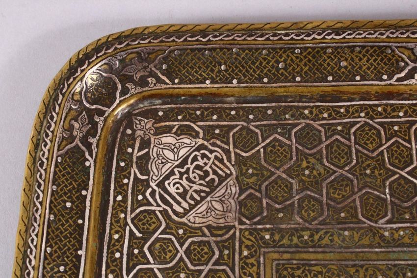 A FINE 19TH CENTURY MAMLUK REVIVAL SILVER INLAID DAMASCUS TRAY, inlaid with silver bands of calligraphy and motif, 31.5cm x 22cm.