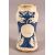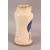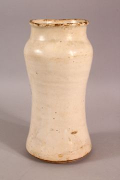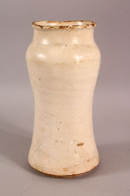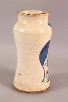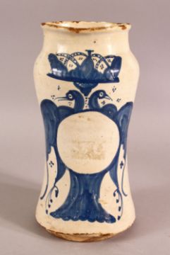 A GLAZED POTTERY BLUE AND WHITE MEDICINE JAR, the body decorated with emblem depicting birds and crown, 24cm high.