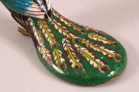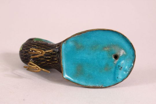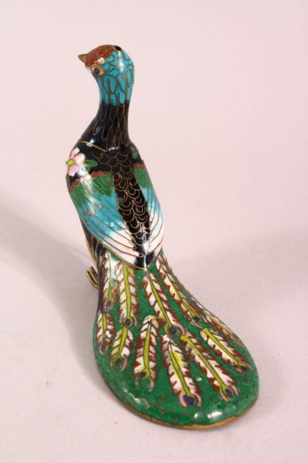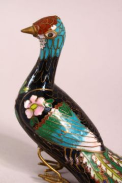 A CHINESE CLOISONNE ENAMEL MODEL OF A PEACOCK, 12cm.