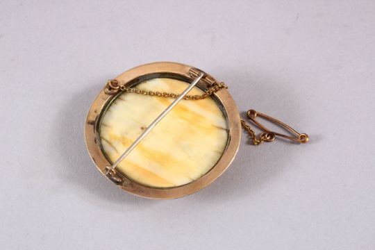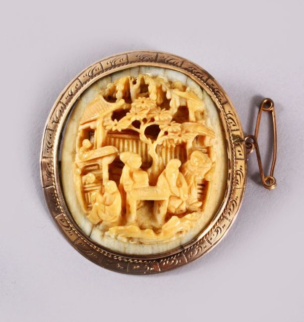 A CHINESE CANTON CARVED IVORY BROOCH, mounted in gold coloured metal ( possibly gold ), carved depicting figures in landscapes with temples, 4.5cm