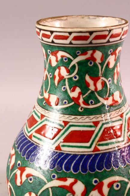 A TURKISH OTTOMAN 18TH CENTURY IZNIK VASE, with green and red motif decorations, 26cm