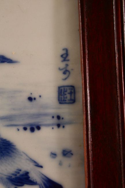 A PAIR OF CHINESE BLUE & WHITE PORCELAIN FRAMED PANELS - each decorated with birds amongst flora - each signed and enclosed in hardwood frames - 23cm x 18cm