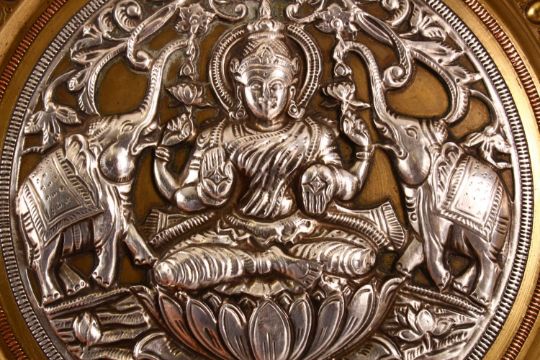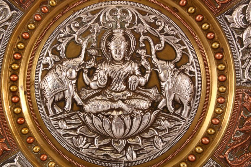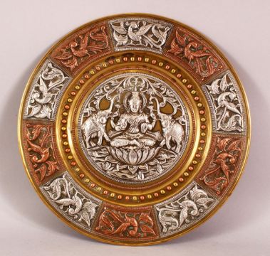 A FINE 19TH CENTURY SOUTH INDIAN TANJORE SILVER AND COPPER INLAID BRASS CHARGER depicting Hindu gods, 28cm diameter.