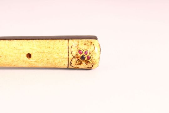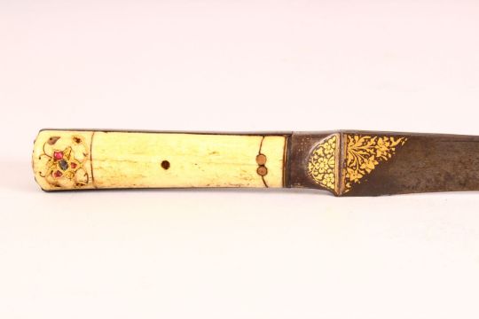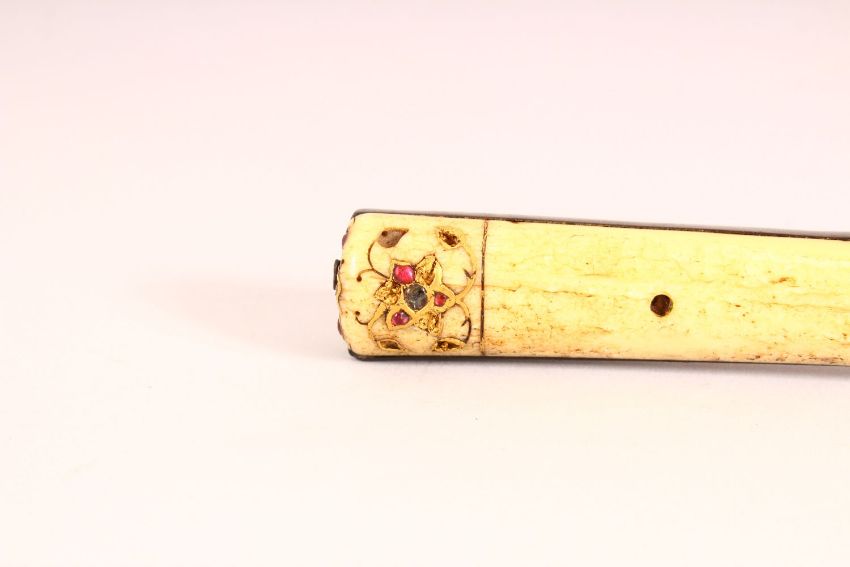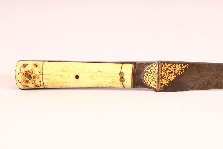 A GOOD INDIAN CARVED BONE & INLAID WATERED STEEL DAGGER - with carved bone handle inlaid with gold and semi precious stones, the blade with inlaid gilt decoration, 34cm