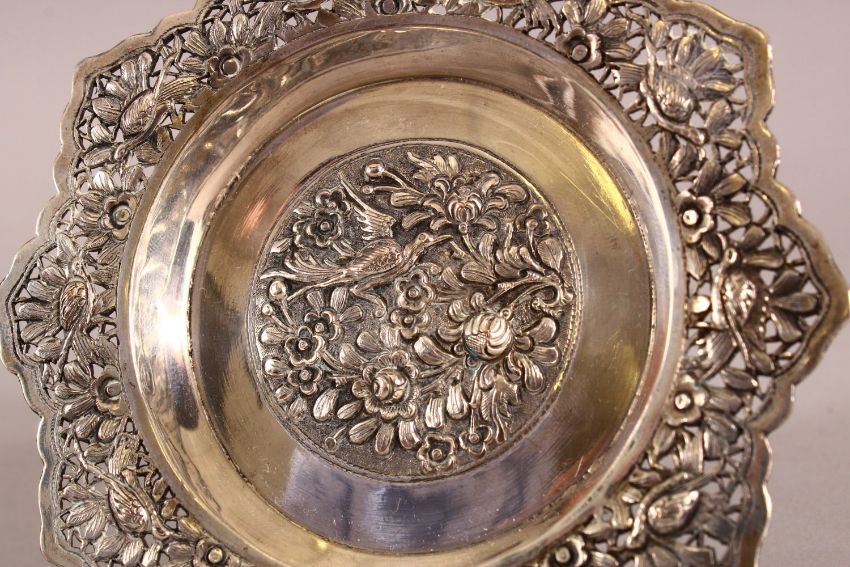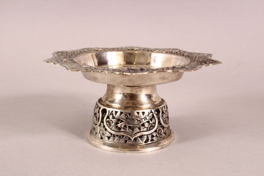A 19TH CENTURY CHINESE SILVER STEM DISH - Decorated with relief of birds and foliage - 11cm