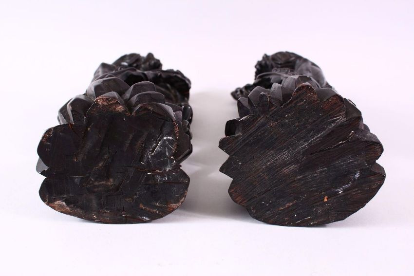 A LARGE PAIR OF 19TH CENTURY CHINESE SILVER COLOUR WIRE INLAID FIGURES OF SAGES, the mirrored pair of figures inlaid with silver coloured metal inlay, depicted holding a bat in his hand, upon a rocky formed base with his staff, 44cm high