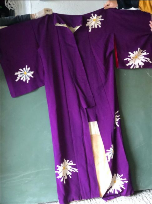 A PURPLE SILK CRAPE KIMONO decorated with daisies, approx 5ft long.