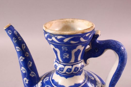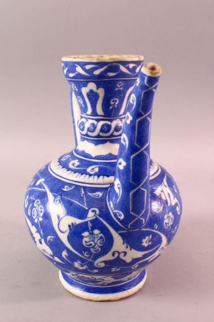 AN IZNIK STYLE CANTAGALLI BLUE & WHITE WATER URN, with motif decoration and a mark to the base, 25cm