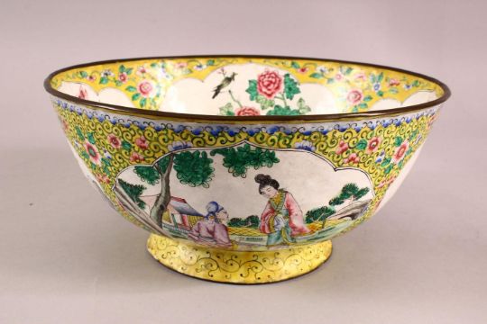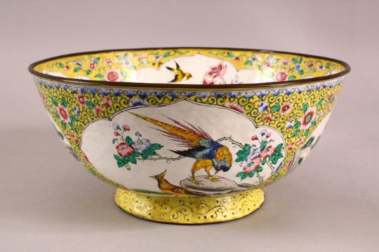 A GOOD CHINESE CANTON ENAMEL BOWL, decorated with panels of birds and flora with a yellow surrounding ground, the centre with ducks,26.5cm