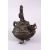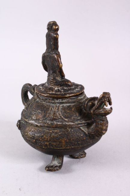 AN EARLY CHINESE OR SOUTH EAST ASIAN BRONZE LIDDED OIL LAMP, overall height 13cm, width 12cm.