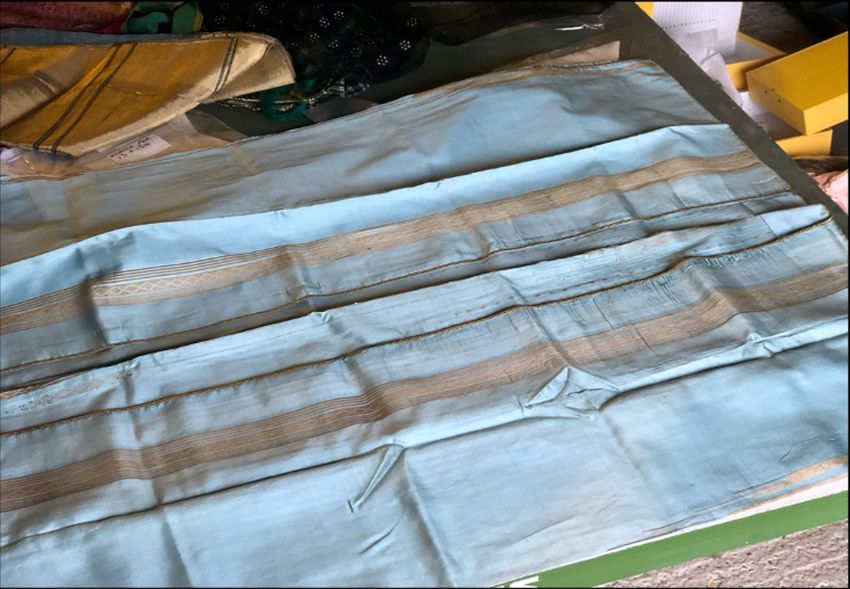 A SYRIAN ABBA SLEEVELESS GOWN, turquoise ground with gilt decoration (af), approx. 4ft 6in long.