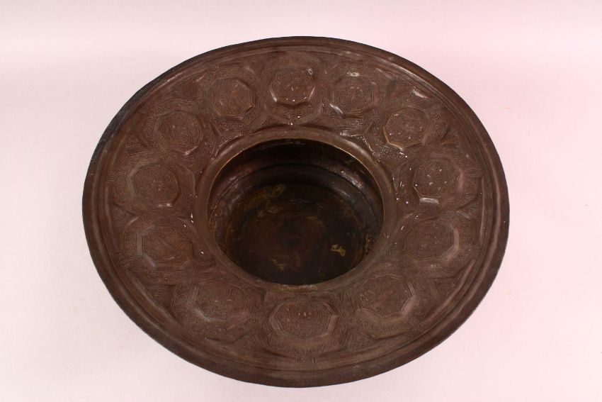 A LARGE 18TH CENTURY DAMASCUS MAMLUK REVIVAL BRASS BASIN, with traces of silver inlay, with embossed and chased decoration, 42cm diameter.