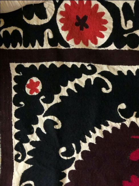A GOOD LARGE EMBROIDERED COTTON WALL/FLOOR COVERING, circa 1920, Tashkent Susani, 11ft 10ins x 7ft 8ins.