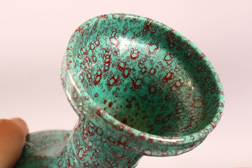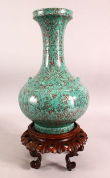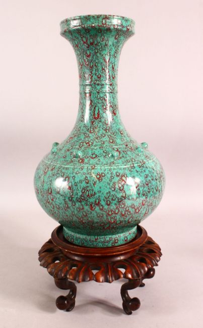 A CHINESE ROBINS EGG GLAZED PORCELAIN VASE & STAND - the body with a robins egg glaze, with raised stud bosses, with a seal mark to base, with a carved hardwood stand, 31cm high ( vase alone )