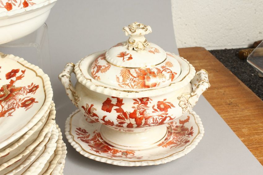 Large tureen, cover and stand 12ins diameter, 12ins high. A pair of sauce tureens, covers and stands, vegetable bowl and cover, 5 dishes 17ins, 15.5ins, 12ins &11ins.