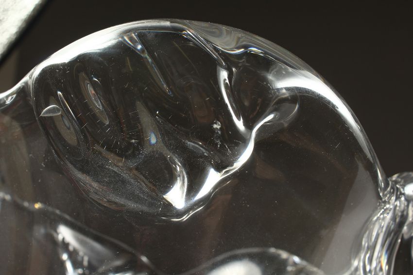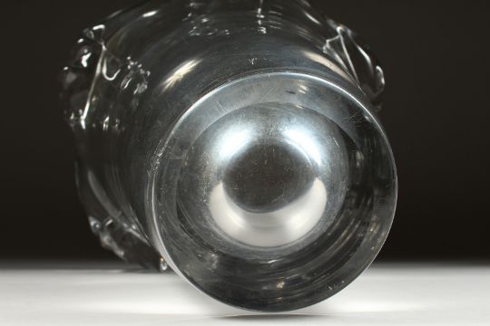 A LARGE HEAVY PLAIN GLASS VASE, the lip as fire scrolling waves