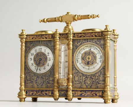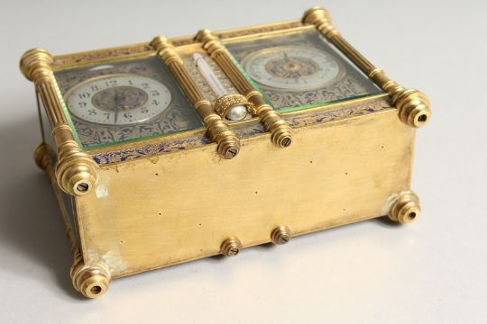 A SUPERB 19TH CENTURY FRENCH BRASS AND ENAMEL DOUBLE CARRIAGE CLOCK, the front with clock and barometer with blue floral enamel and column sides