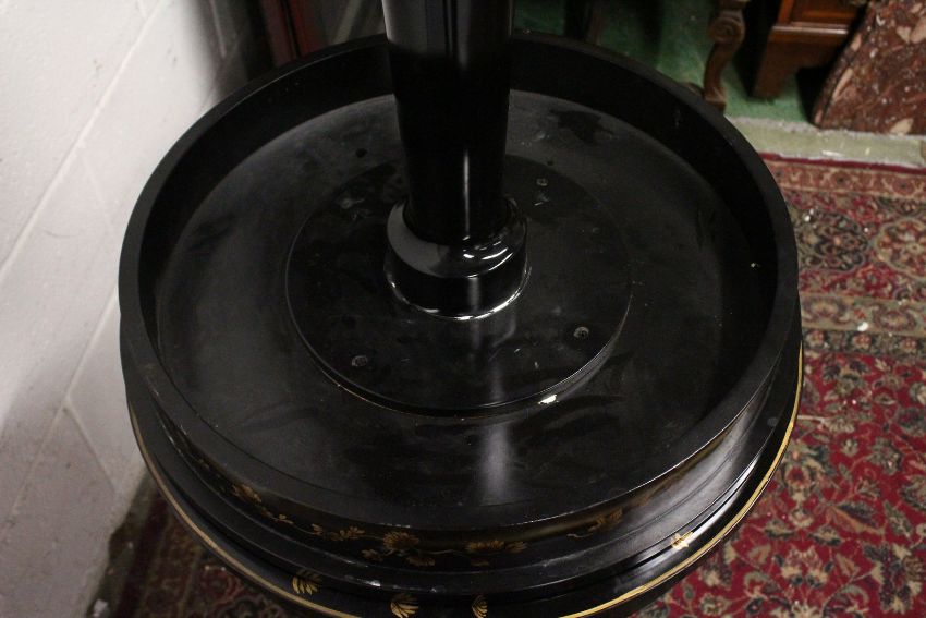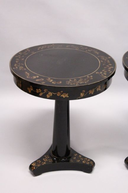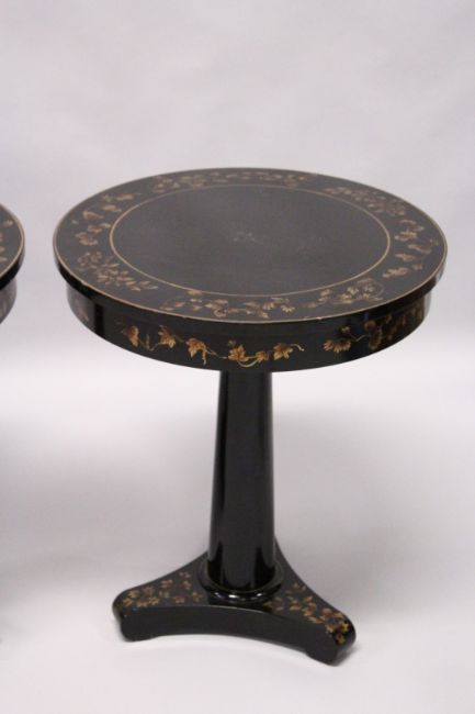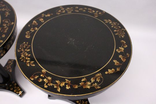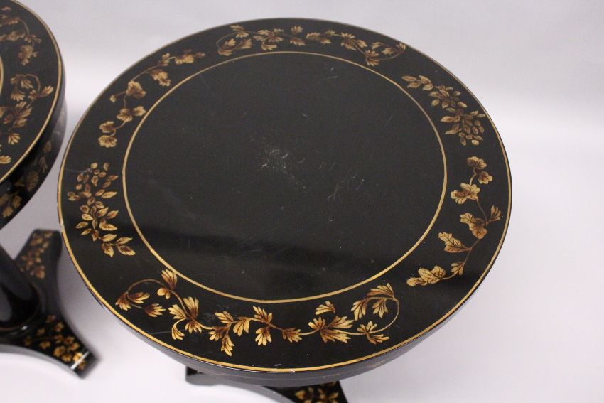 A PAIR OF BLACK LACQUER CIRCULAR PEDESTAL TABLES, 20th Century, the tops frieze and tricorn base decorated with a gilded leaf design.