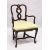 A SMALL GEORGE II DESIGN MAHOGANY OPEN ARMCHAIR with curved cresting, wavy splats, shepherd’s crook arms, overstuffed seat on stretchered cabriole legs with carved feet.