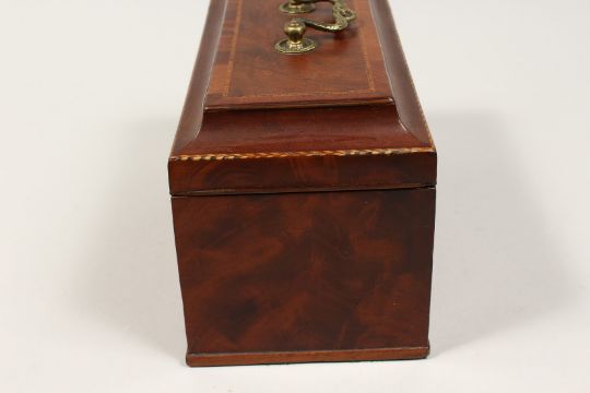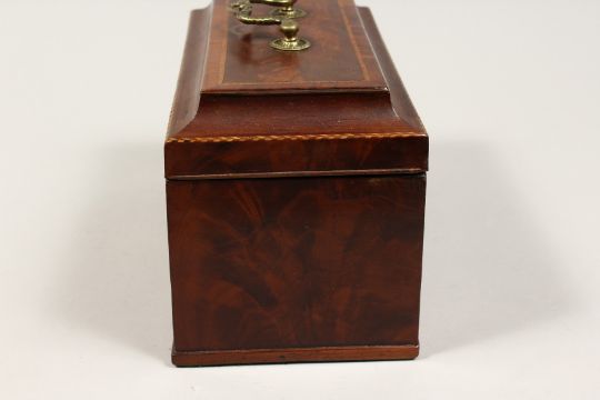 A GEORGE III MAHOGANY THREE DIVISION CADDY with banded top, brass carrying handle and escutcheon.