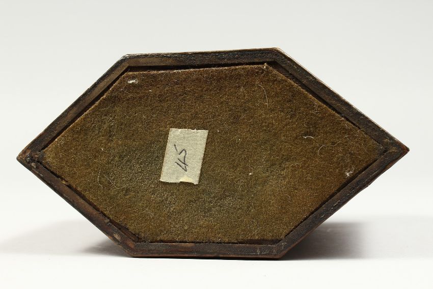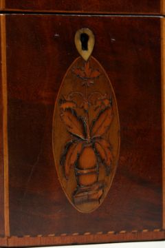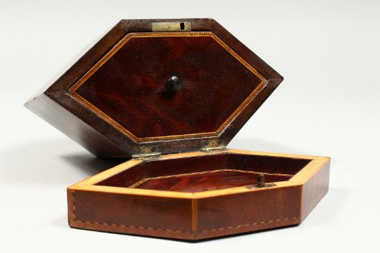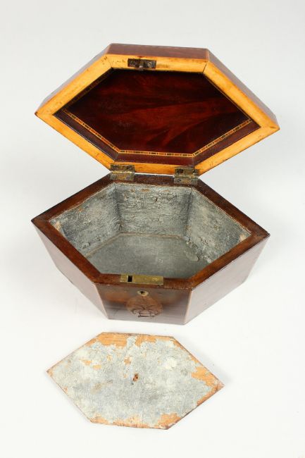 A GOOD GEORGE III MAHOGANY HEXAGONAL SHAPED TEA CADDY with satinwood stringing and oval.