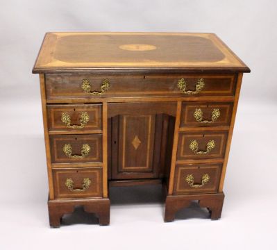 A GOOD EDWARDIAN MAHOGANY SATINWOOD BANDED AND INLAID KNEEHOLE DESK, with an inlaid rectangular top, long frieze drawer, three drawers to each pedestal with small drawers and door to the centre, supported on bracket feet.