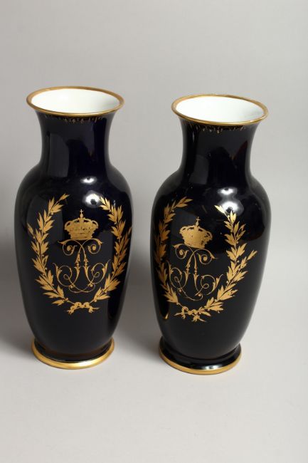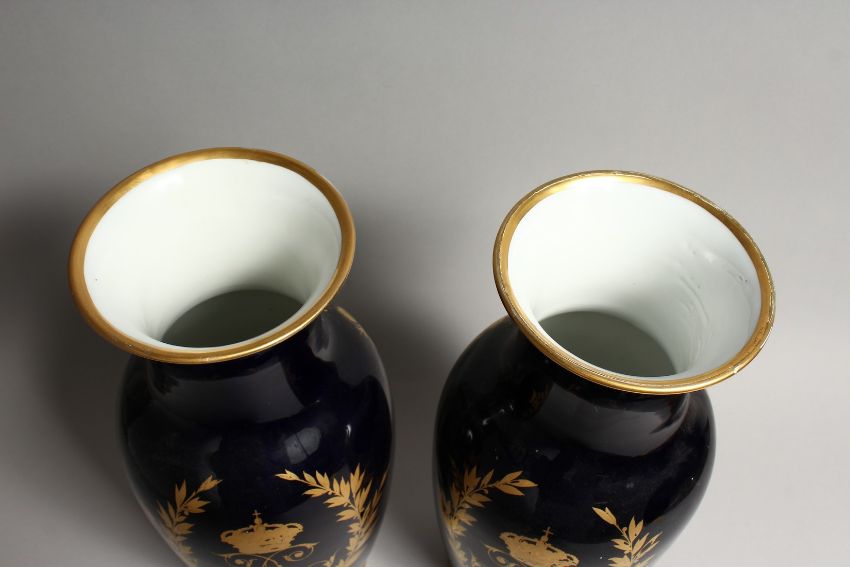 A SUPERB LARGE PAIR OF SEVRES PORCELAIN VASES rich deep blue, painted with a large panel of girls, reverse with initial.