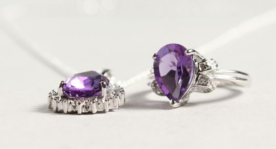 A SILVER AMETHYST AND DIAMOND PENDANT AND RING
