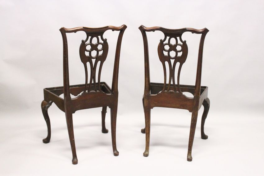 A GOOD PAIR OF GEORGE III MAHOGANY SINGLE CHAIR FRAMES, with carved cupids bow cresting rail, pierced and carved vase shaped splat with entwined knot design, the frame supported on cabriole legs carved